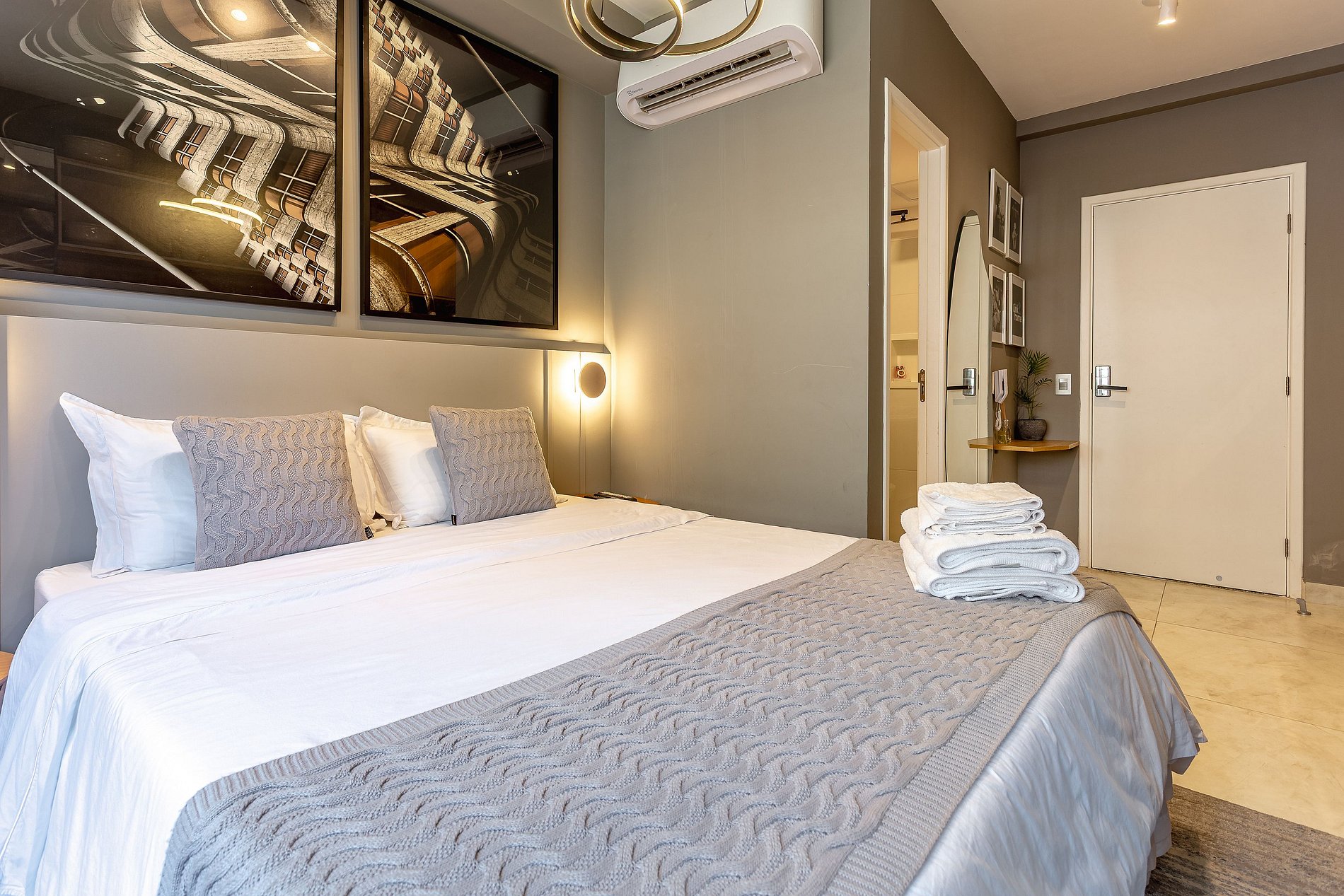 Conforto Todo Dia: Uma cama de qualidade com lençóis de alto padrão e uma seleção cuidadosa de amenidades como toalhas macias e produtos de banho de qualidade proporcionam uma experiência de hotel em um ambiente mais pessoal e íntimo.