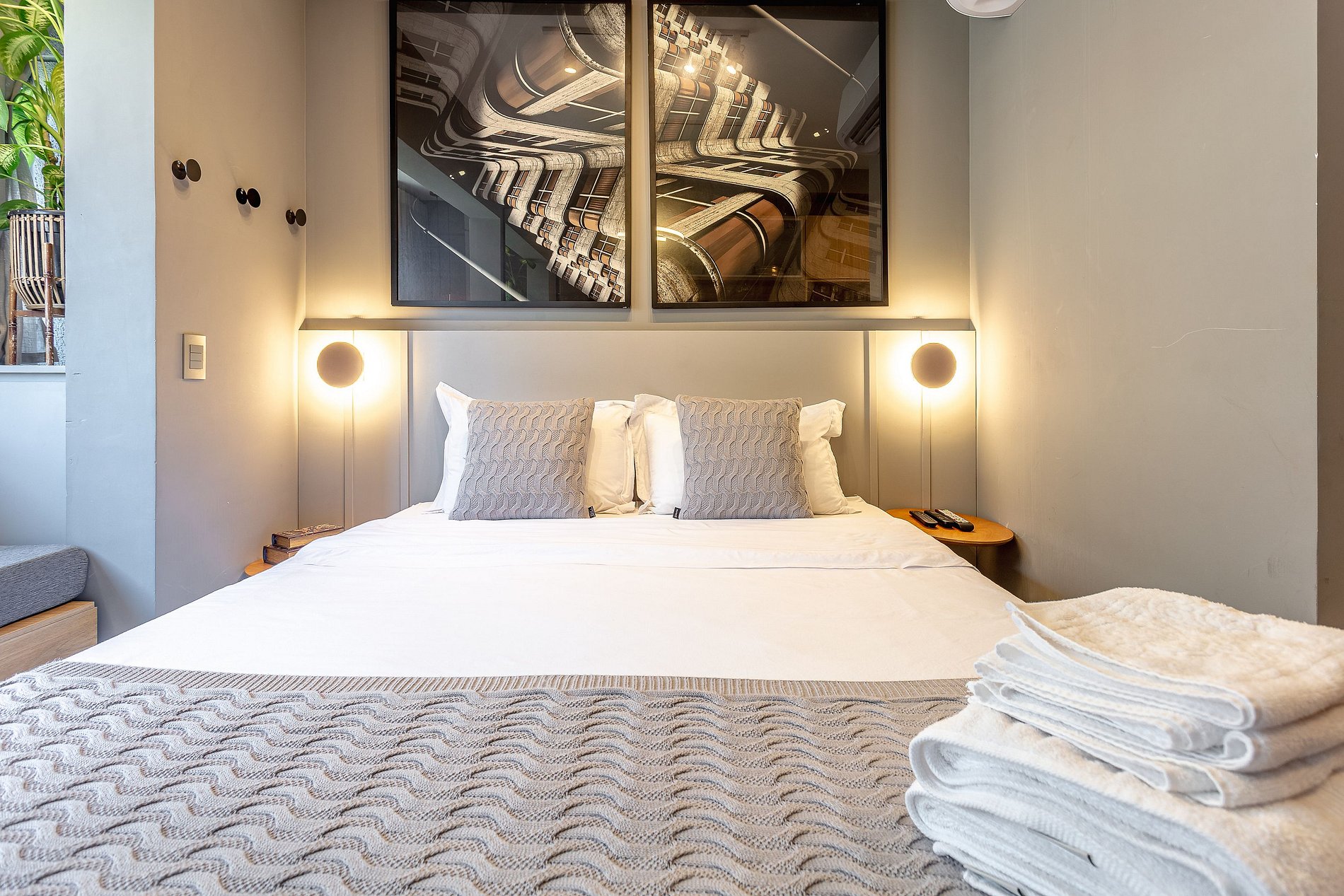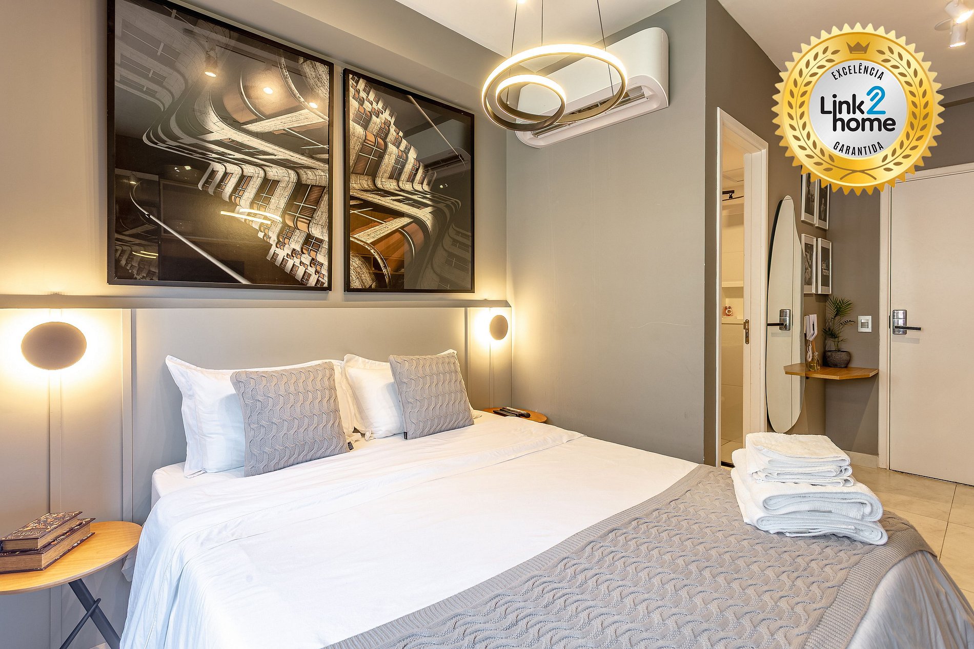 Conforto Todo Dia: Uma cama de qualidade com lençóis de alto padrão e uma seleção cuidadosa de amenidades como toalhas macias e produtos de banho de qualidade proporcionam uma experiência de hotel em um ambiente mais pessoal e íntimo.