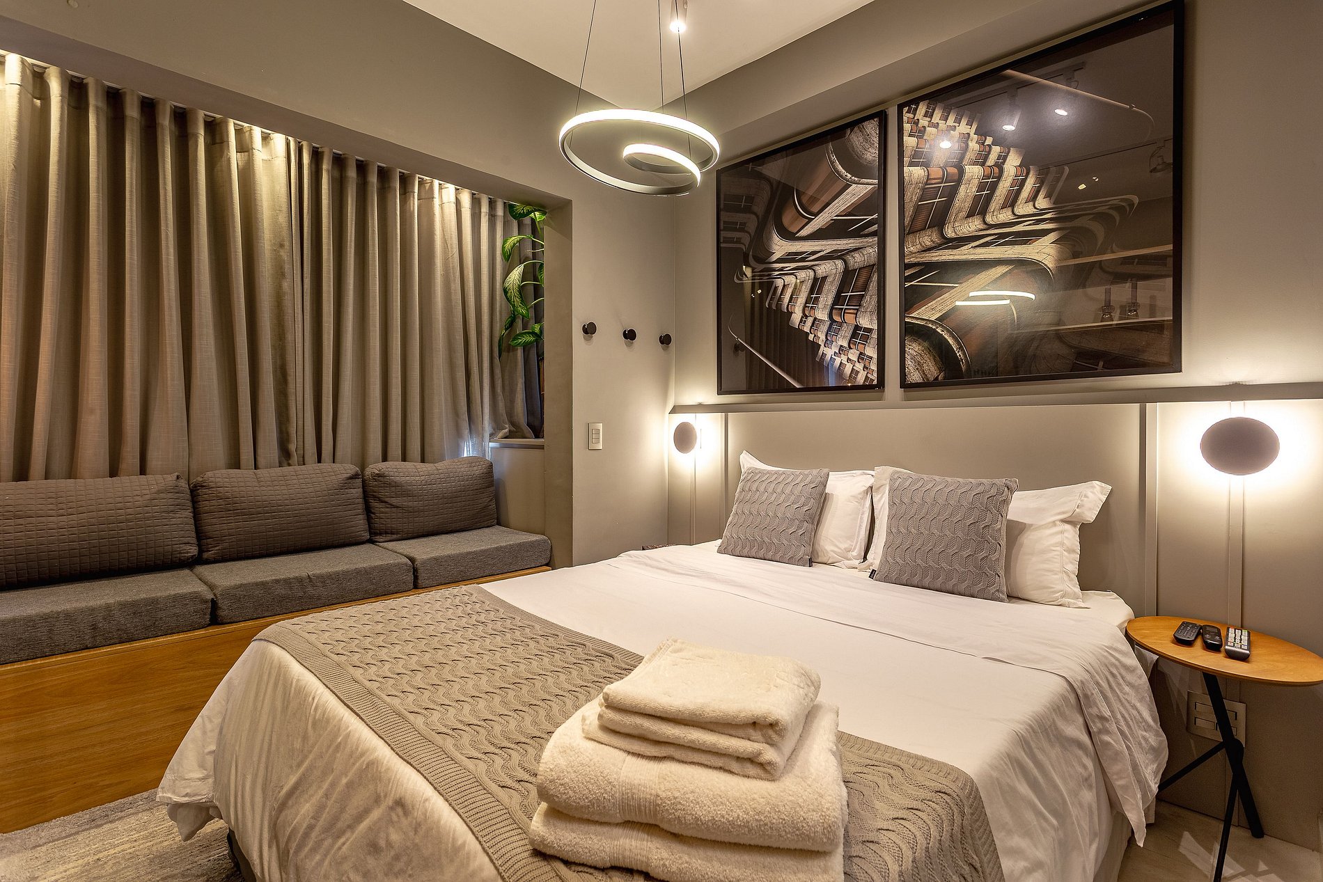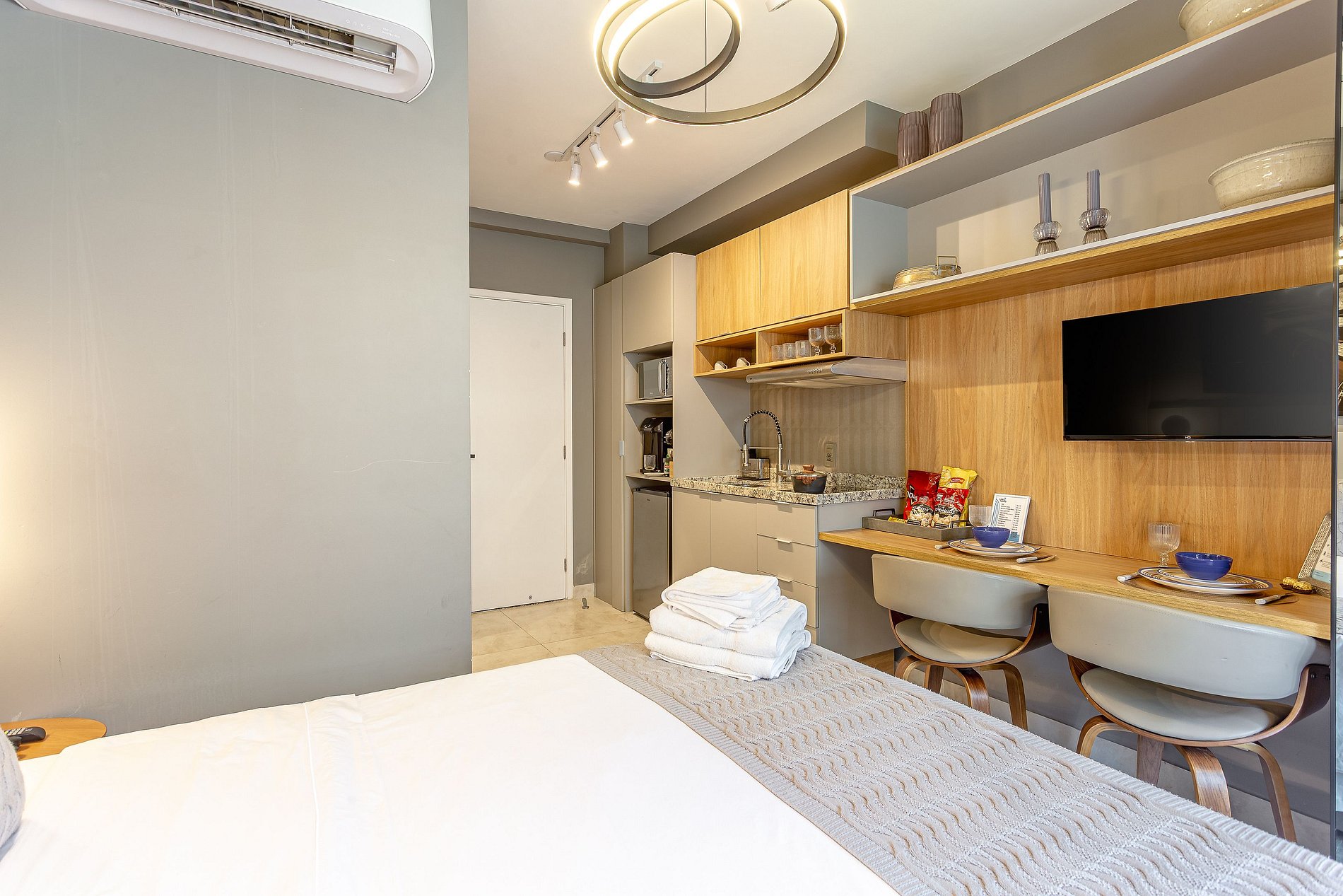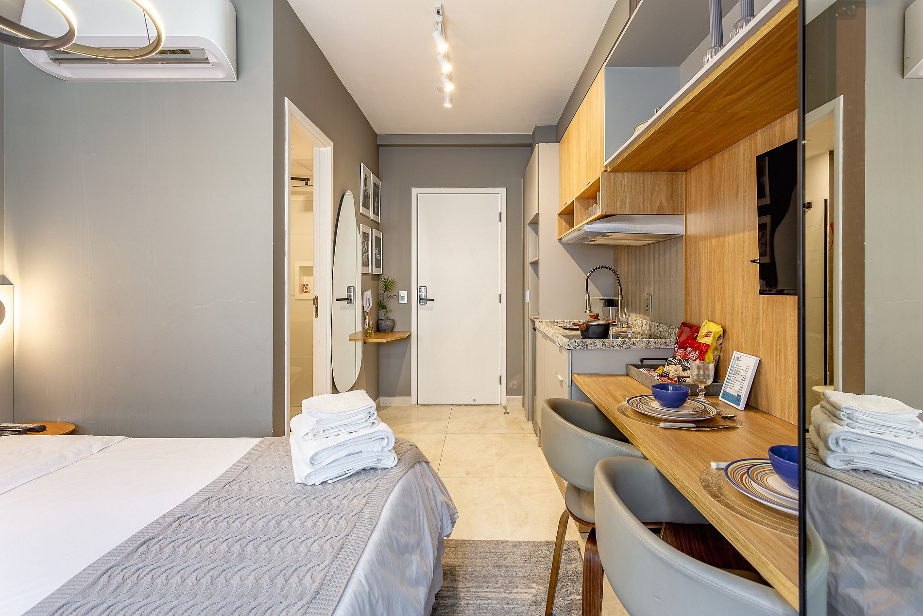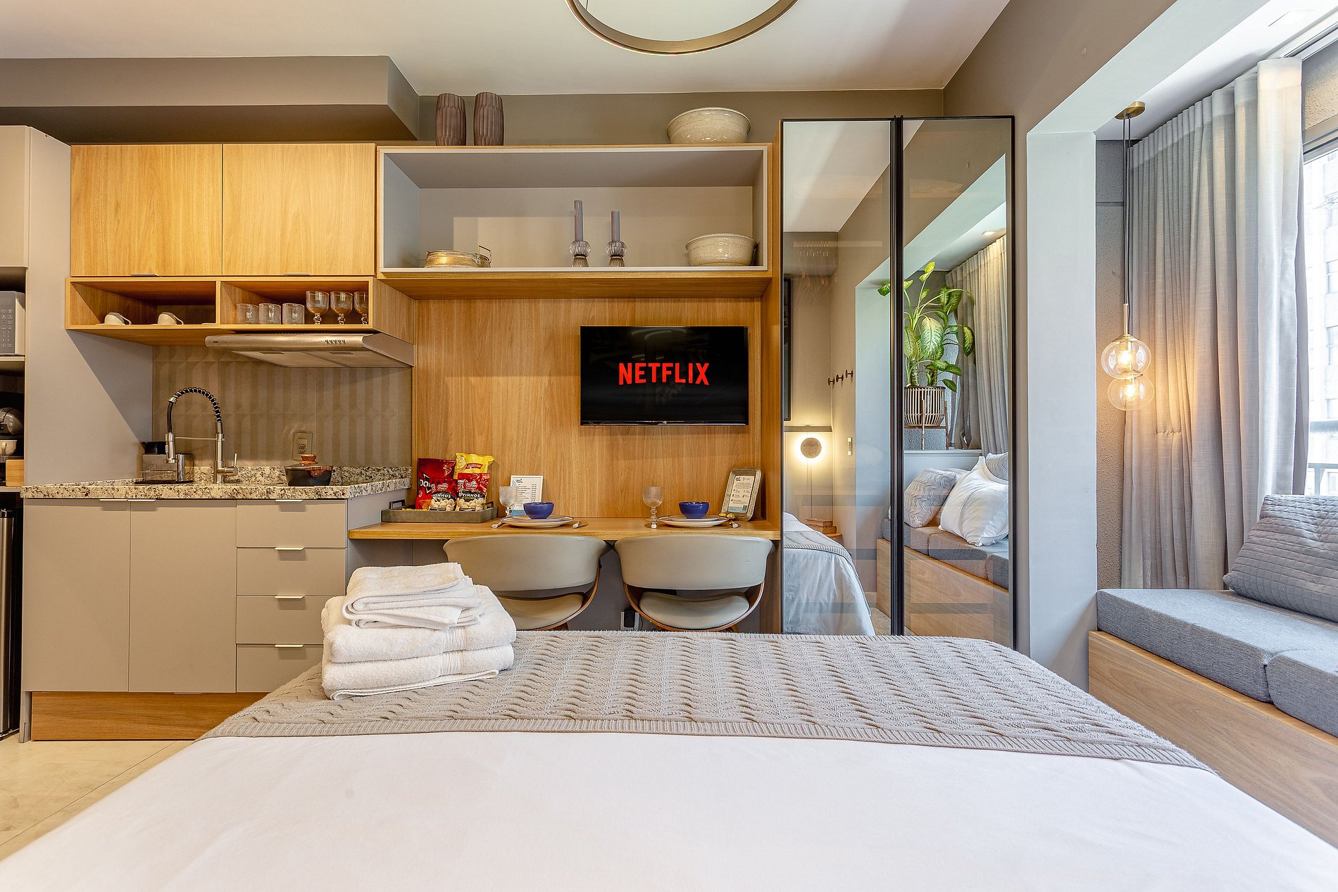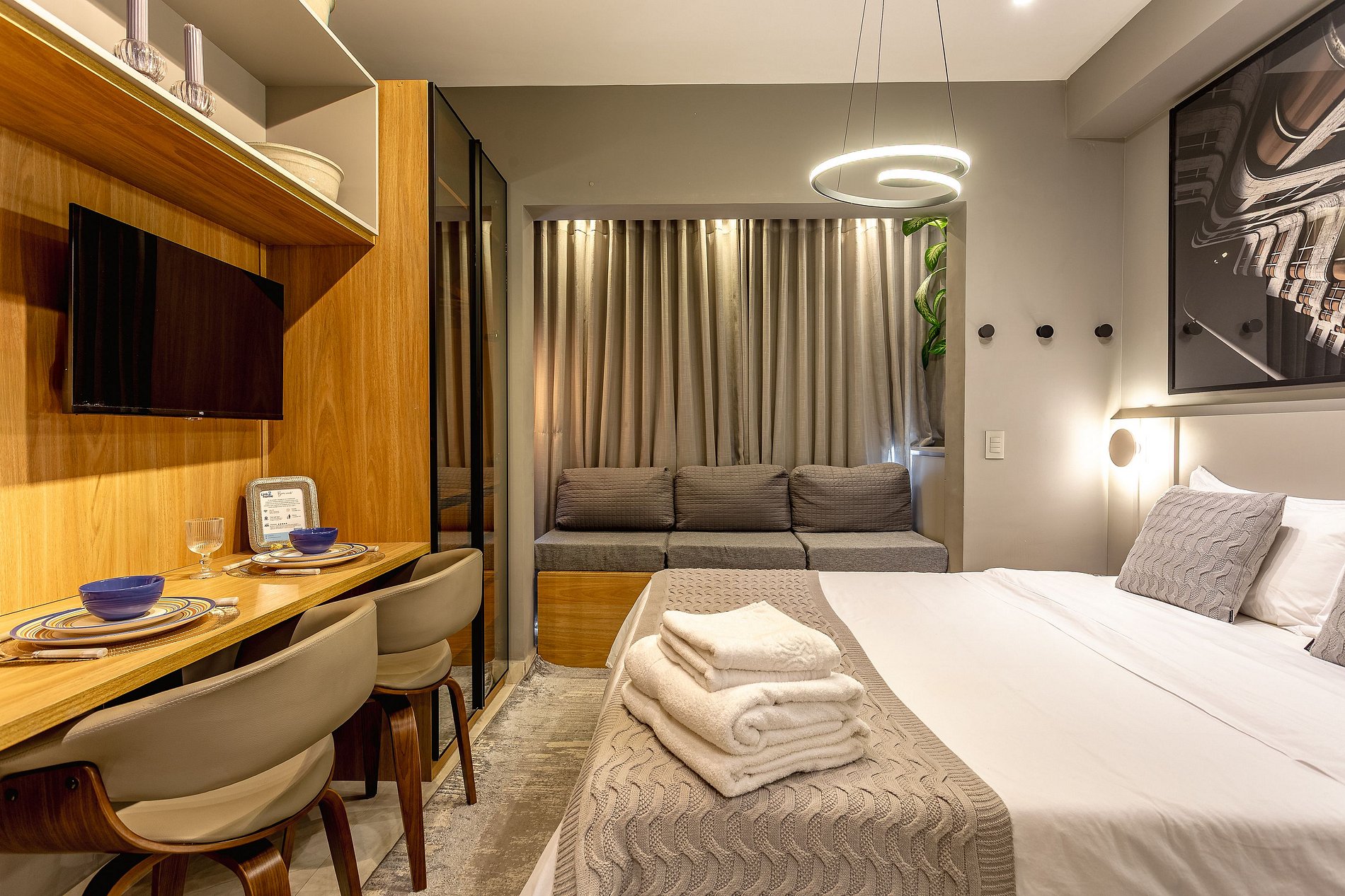Espaço Multifuncional: O layout do estúdio é pensado para ser versátil, atendendo tanto as necessidades de quem está de passagem pela cidade quanto de quem precisa de um local para trabalhar ou relaxar.