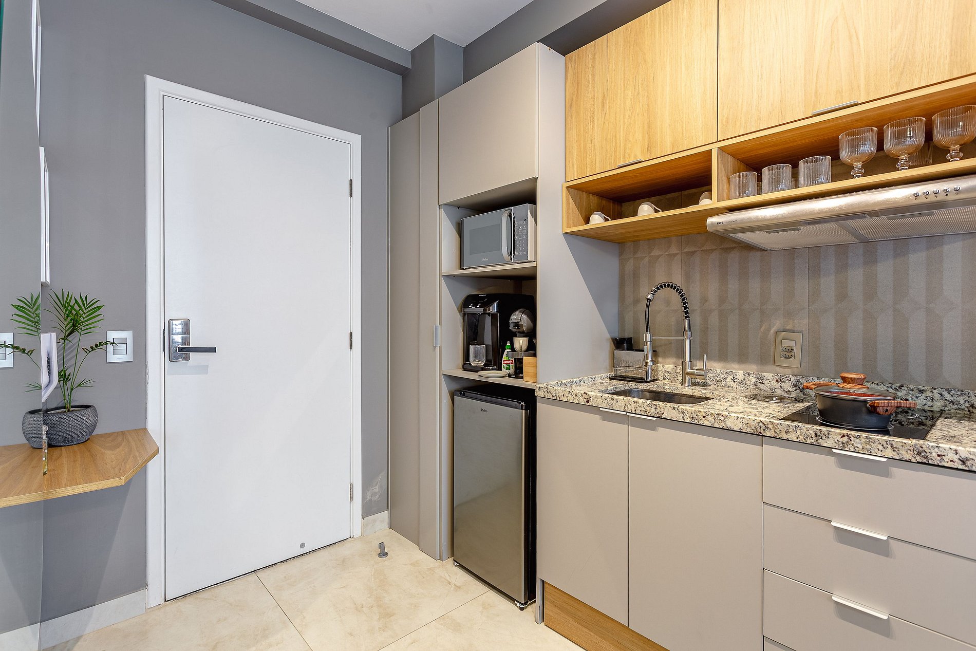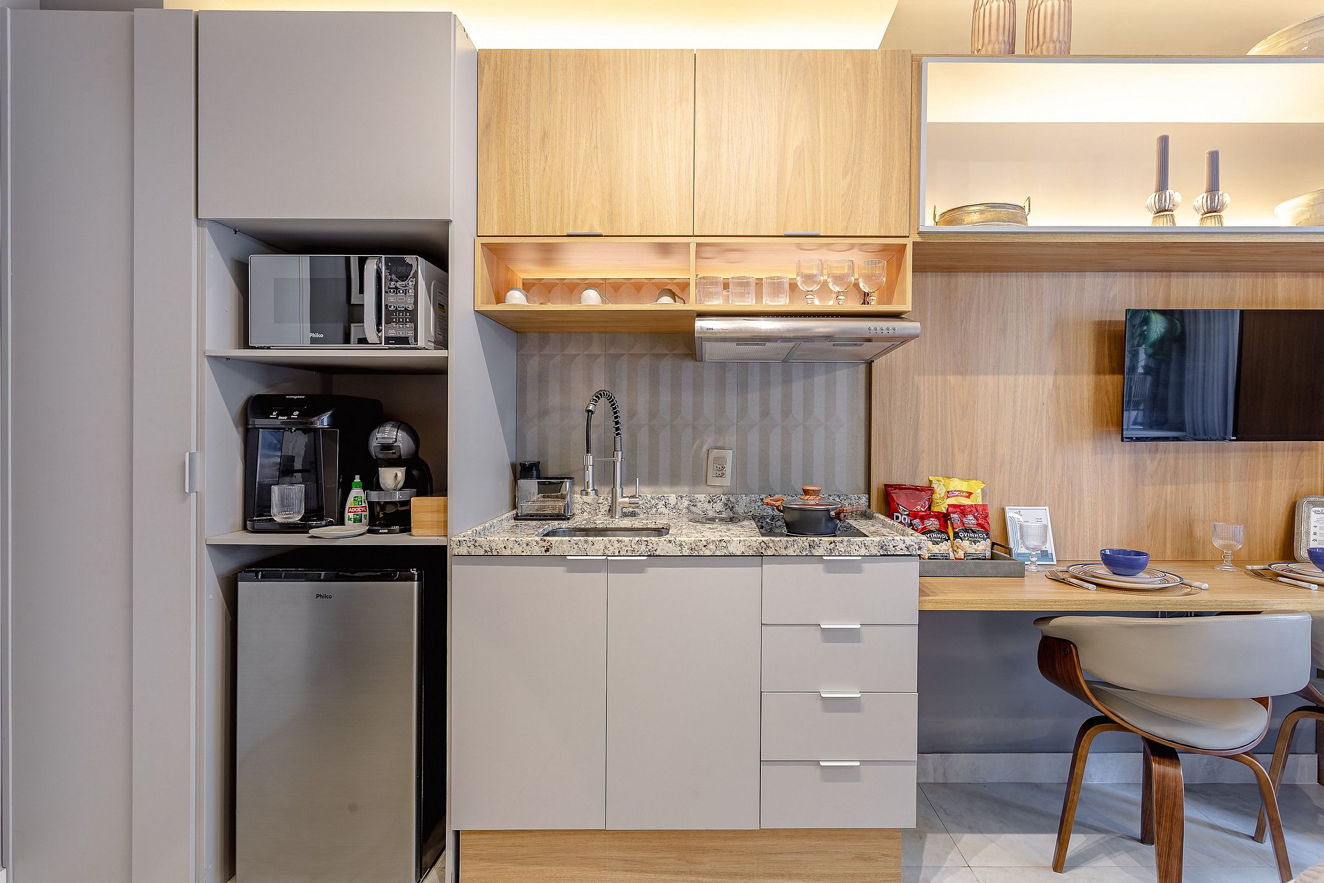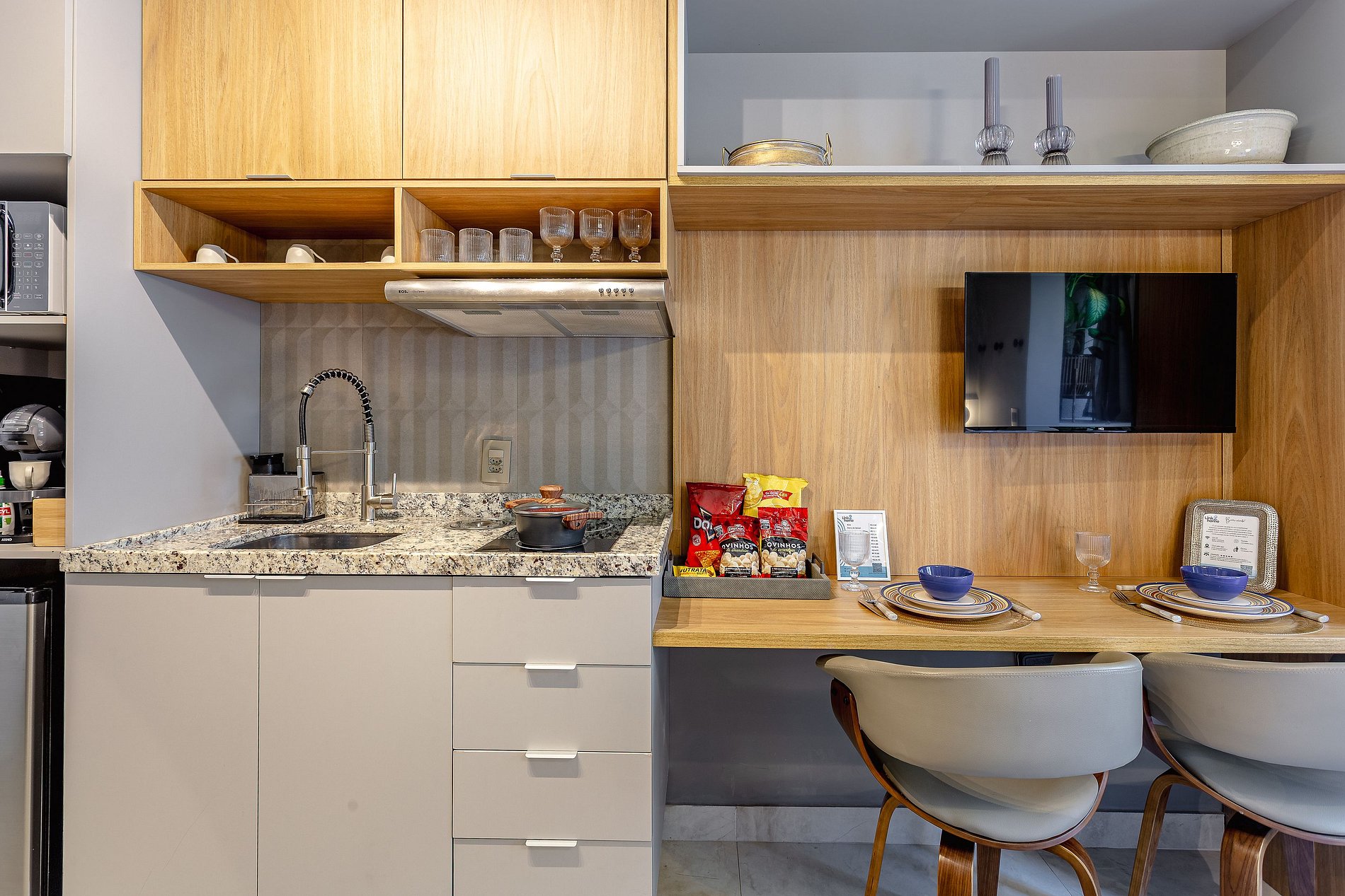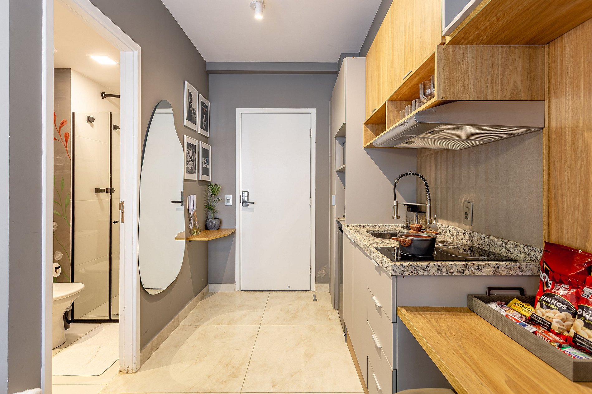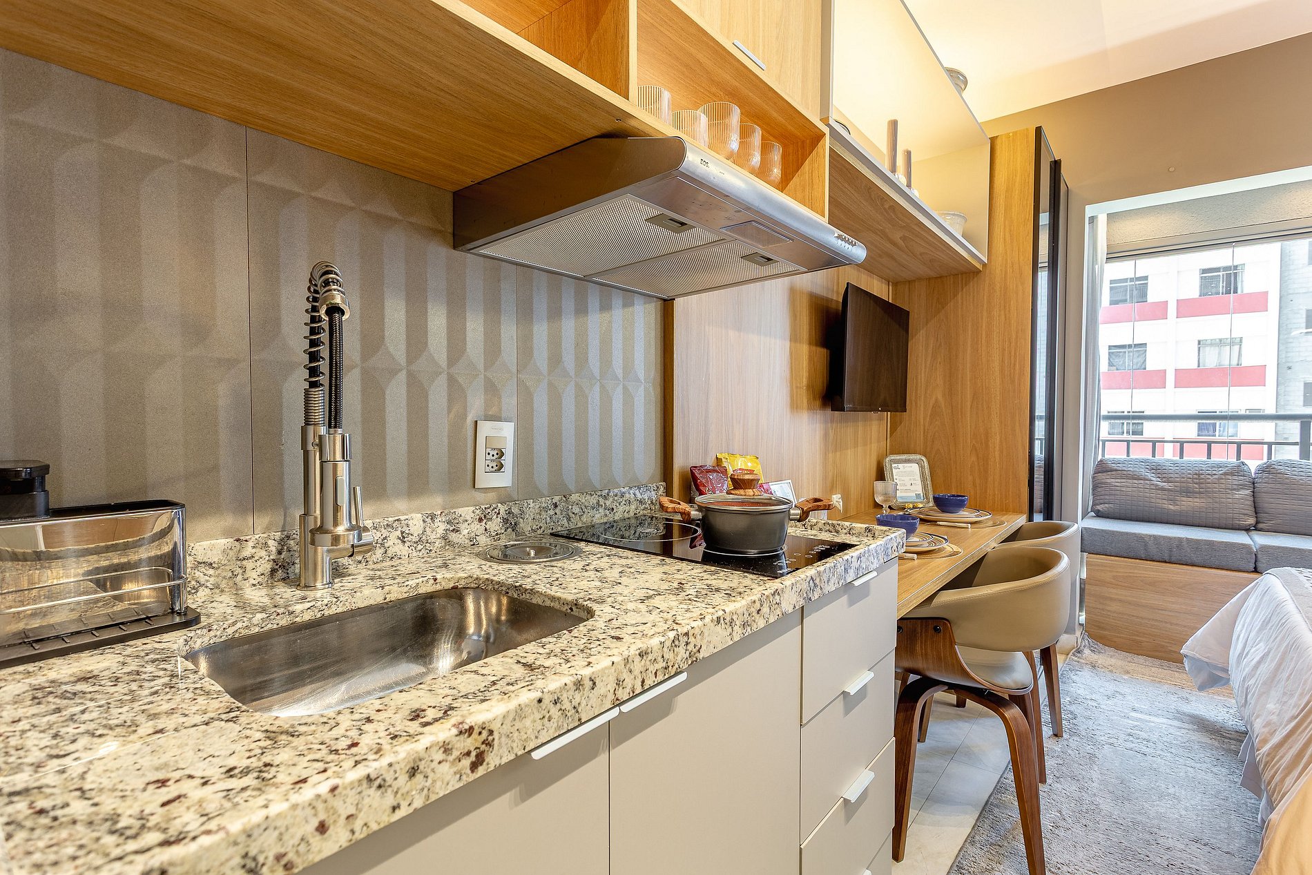 Espaço Multifuncional: O layout do estúdio é pensado para ser versátil, atendendo tanto as necessidades de quem está de passagem pela cidade quanto de quem precisa de um local para trabalhar ou relaxar.