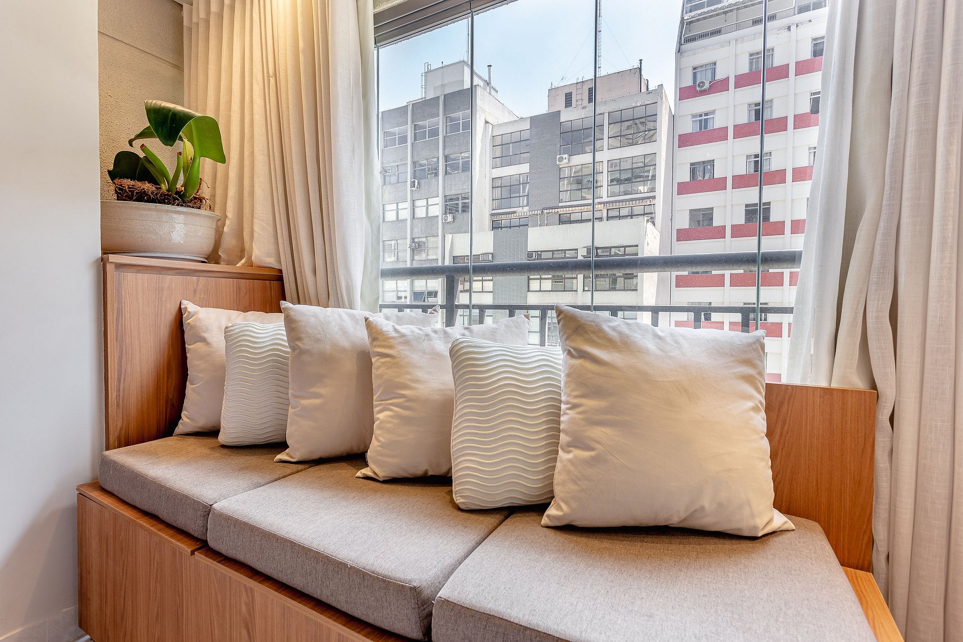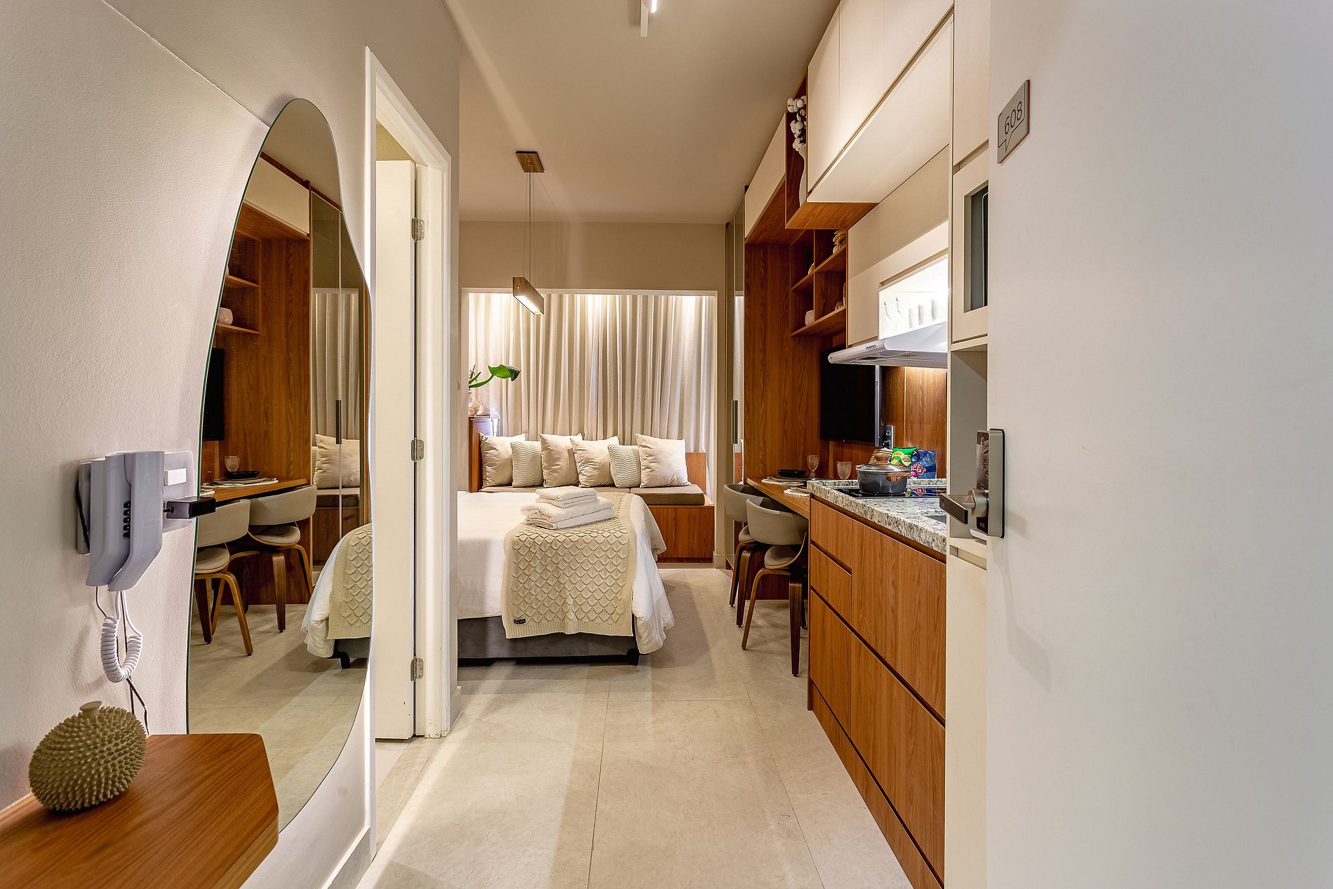 Espaço Multifuncional: O layout do estúdio é pensado para ser versátil, atendendo tanto as necessidades de quem está de passagem pela cidade quanto de quem precisa de um local para trabalhar ou relaxar.