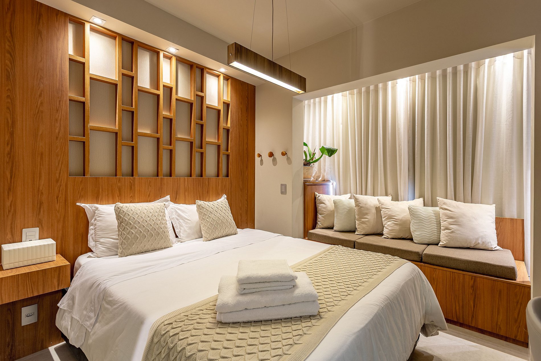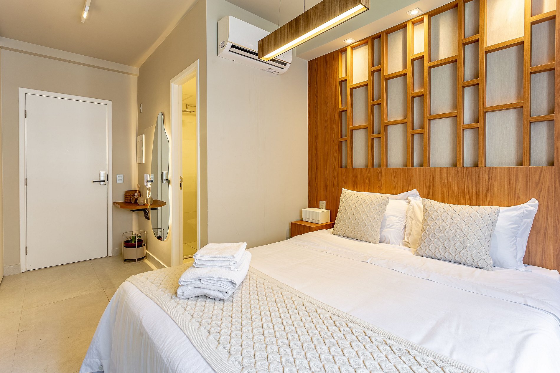 Conforto Todo Dia: Uma cama de qualidade com lençóis de alto padrão e uma seleção cuidadosa de amenidades como toalhas macias e produtos de banho de qualidade proporcionam uma experiência de hotel em um ambiente mais pessoal e íntimo.