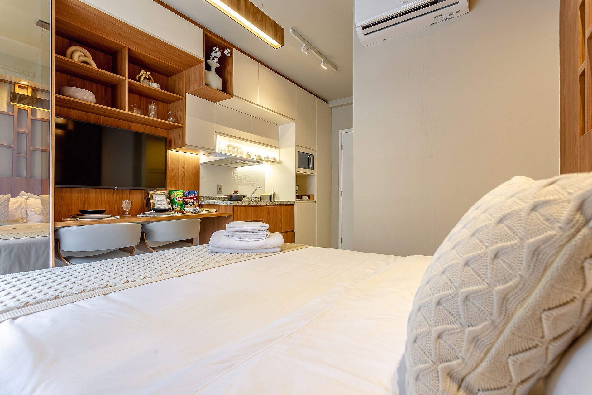 Tecnologia e Conveniência: Equipado com tecnologias modernas como Wi-Fi de alta velocidade, smart TV com acesso a streaming, e uma cozinha completa com eletrodomésticos novos, o estúdio oferece tudo que é necessário para uma estadia confortável e conectada.